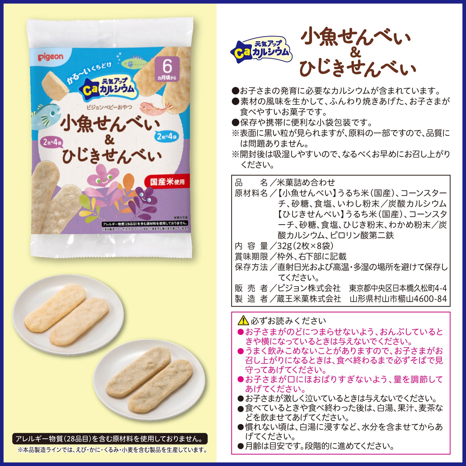 【小魚せんべい】うるち米(国産)、コーンスターチ、砂糖、食塩、いわし粉末/炭酸カルシウム
