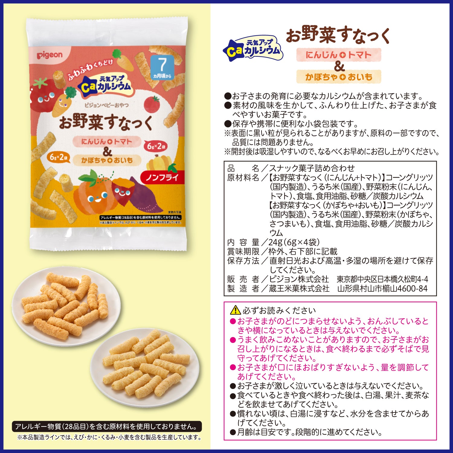 【お野菜すなっく(かぼちゃ+おいも)】コーングリッツ(国内製造)、うるち米(国産)、野菜粉末(かぼちゃ、さつまいも)、食塩、食用油脂、砂糖/炭酸カルシウム