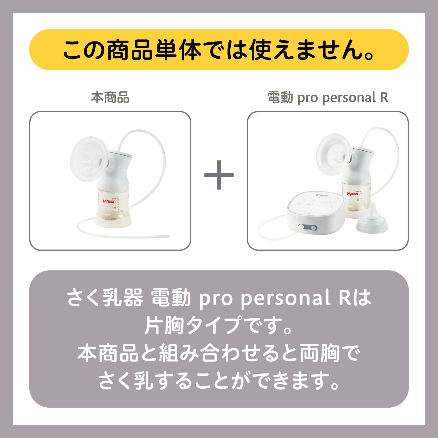 電動pro personal Rは片胸タイプです。本商品と組み合わせると両胸でさく乳することができます。