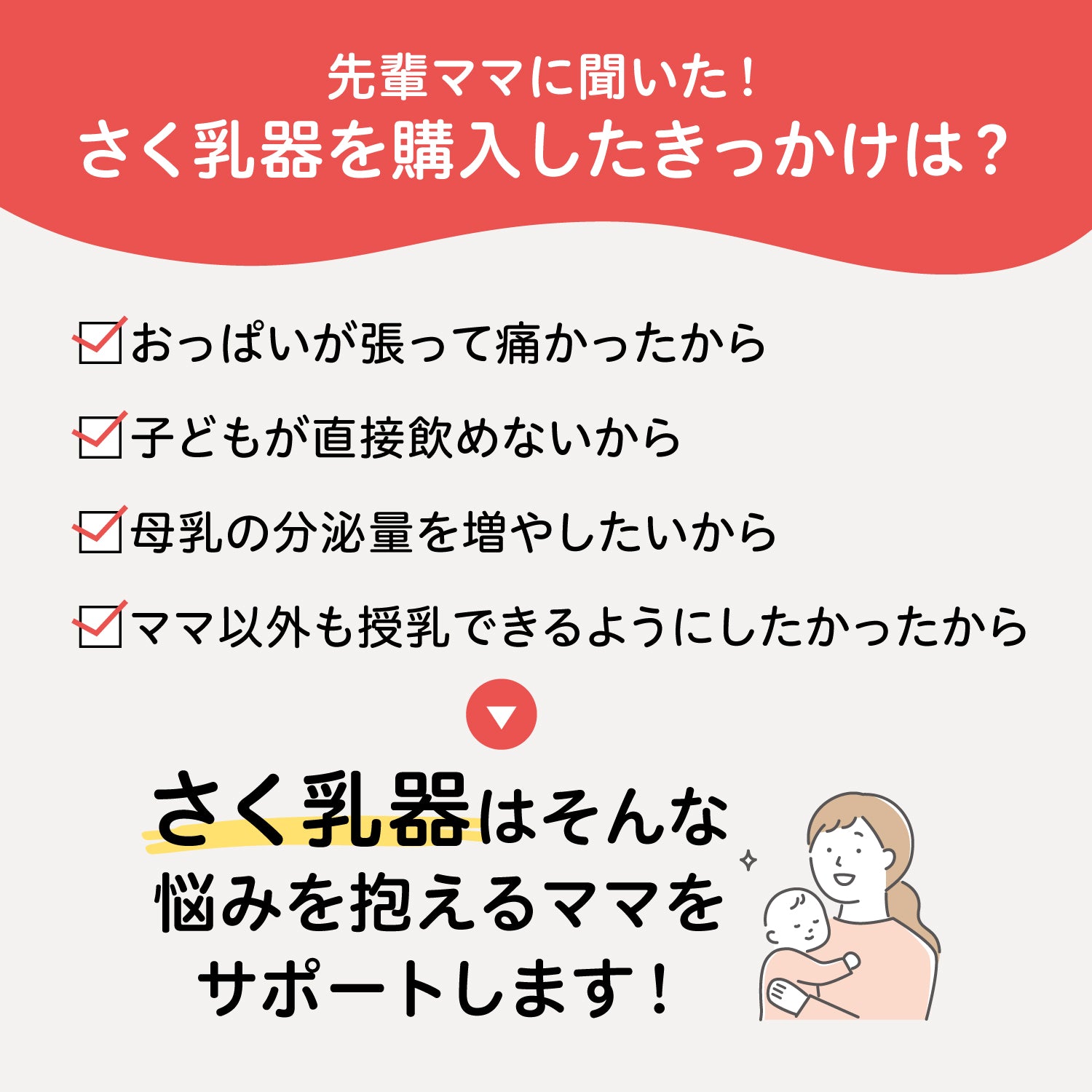 ご購入いただきありがとうございました。さく乳器は産後突然必要になって慌てて購入されるケースがとても多いので、前もって準備していただけたけて良かったです。ママ・パパ・さく乳器の3人4脚で一緒にがんばりましょうー!