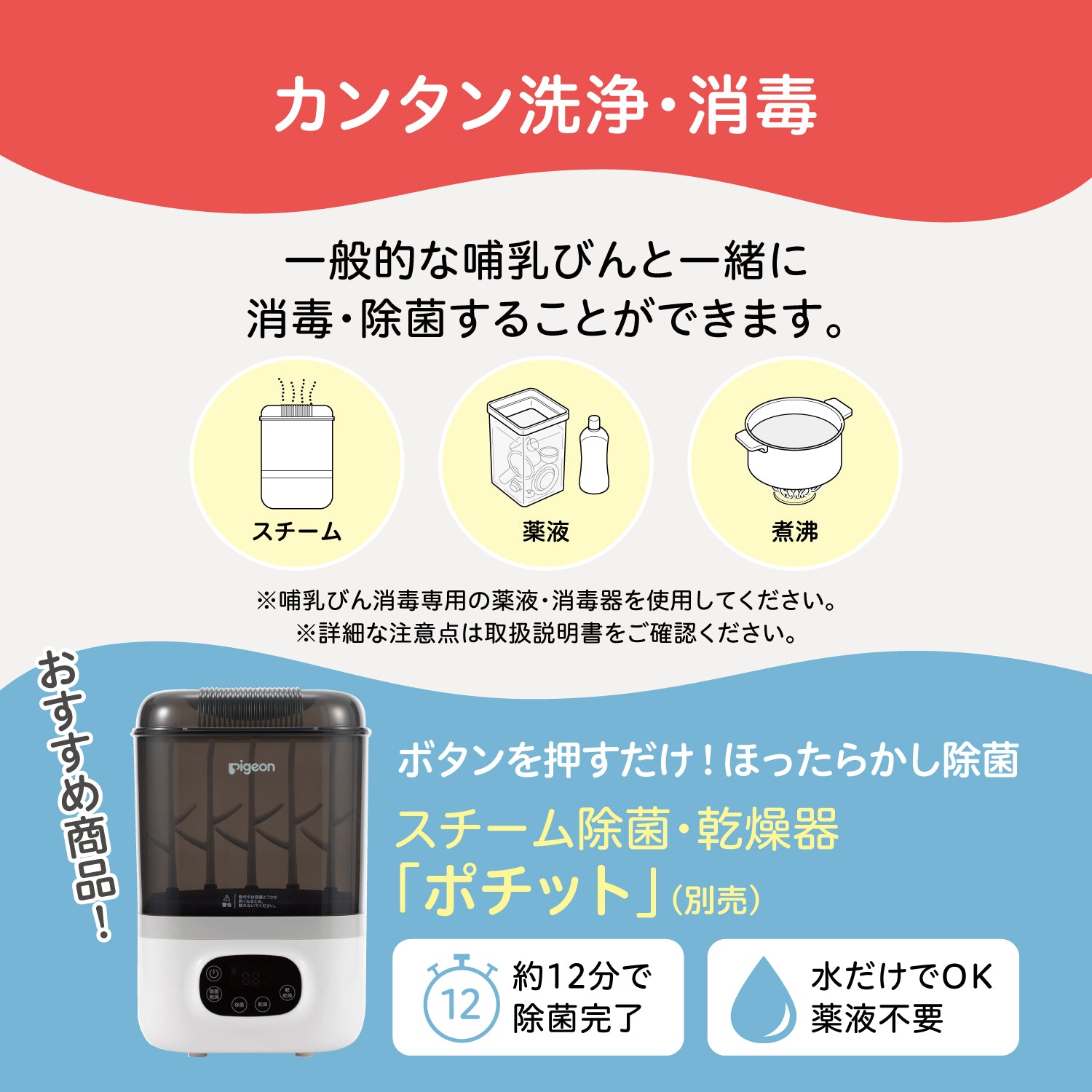 さく乳器や哺乳びんの洗浄・消毒には「ミルクポンW」という商品が便利です。洗浄成分配合の除菌料なので、洗剤・スポンジでのこすり洗い不要で、しっかり洗浄・除菌ができます。お手入れの手間を少しは軽減できるかと思いますので、よろしければぜひお試しください。