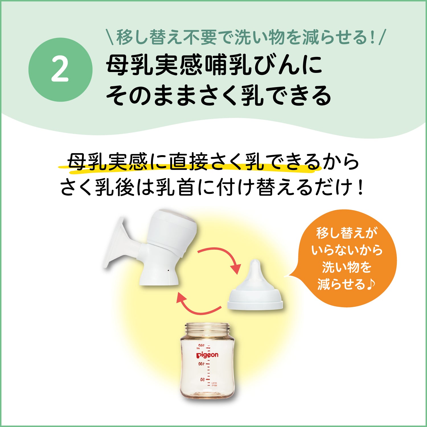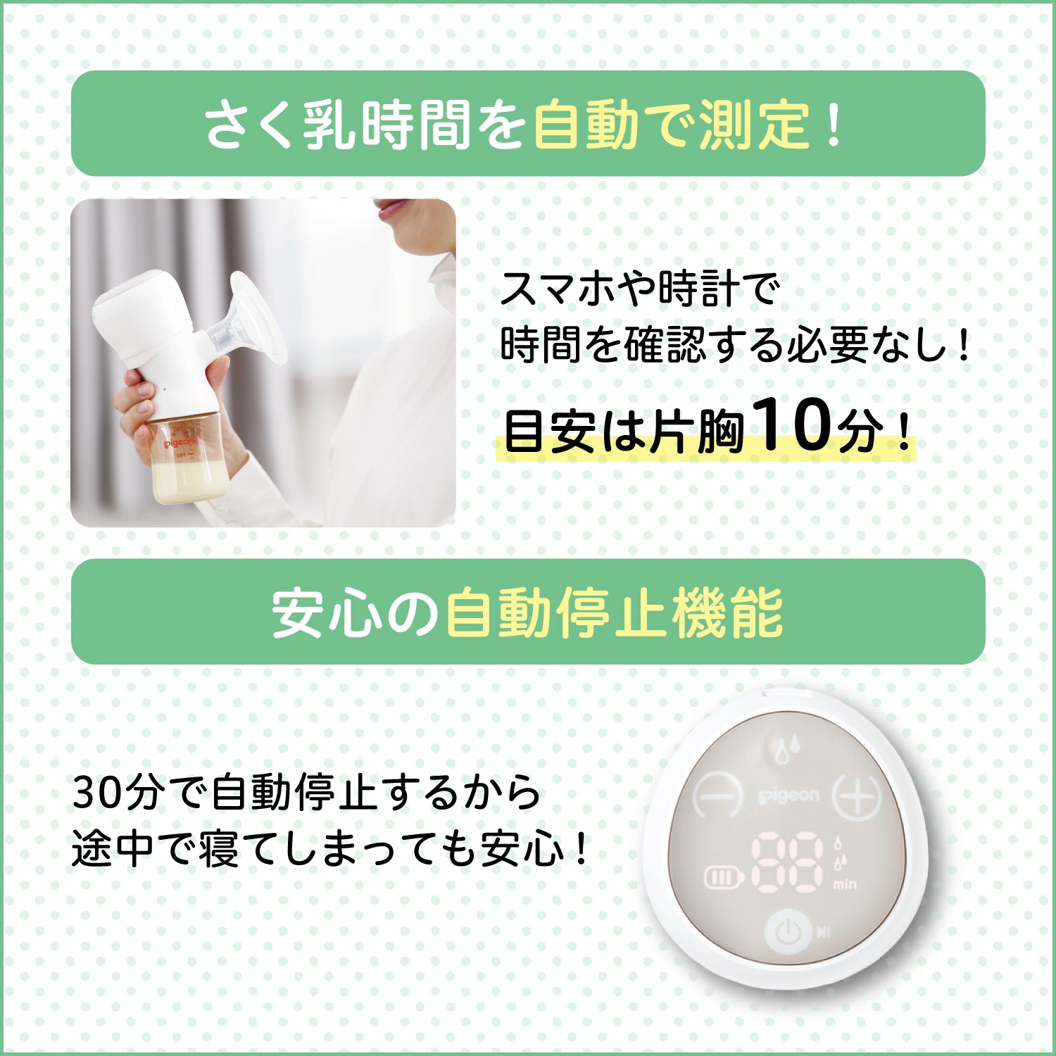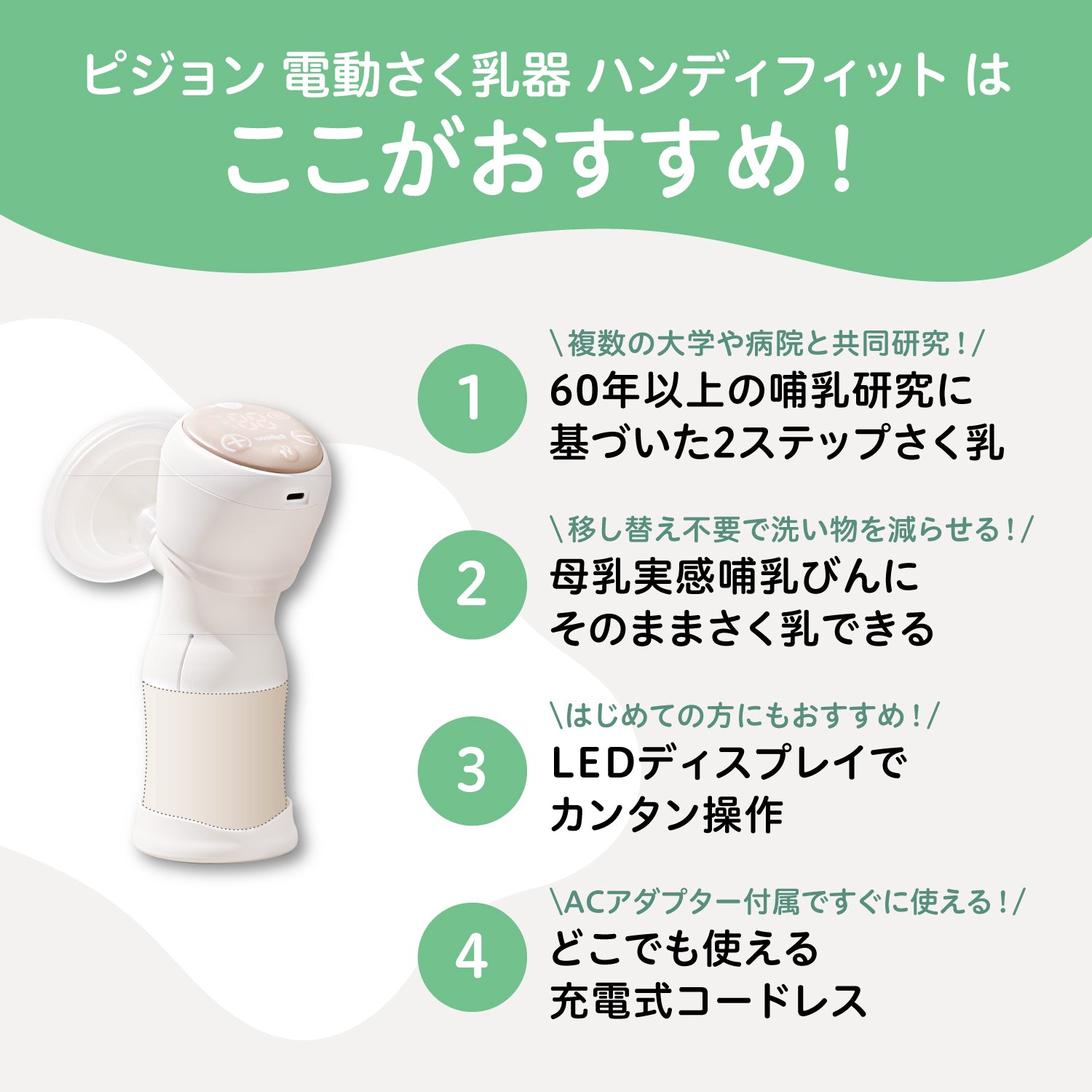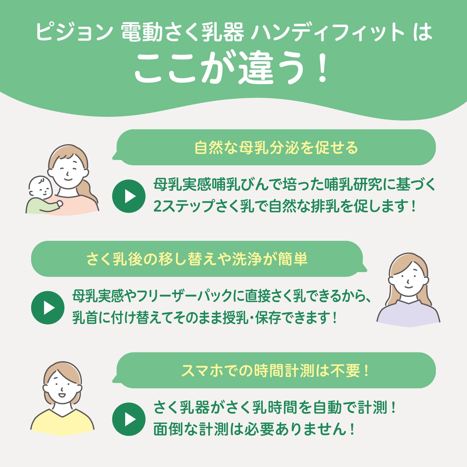 赤ちゃんの飲み方からヒントを得たピジョンオリジナルの2ステップさく乳「赤ちゃんここちリズム」で母乳がとれます。
