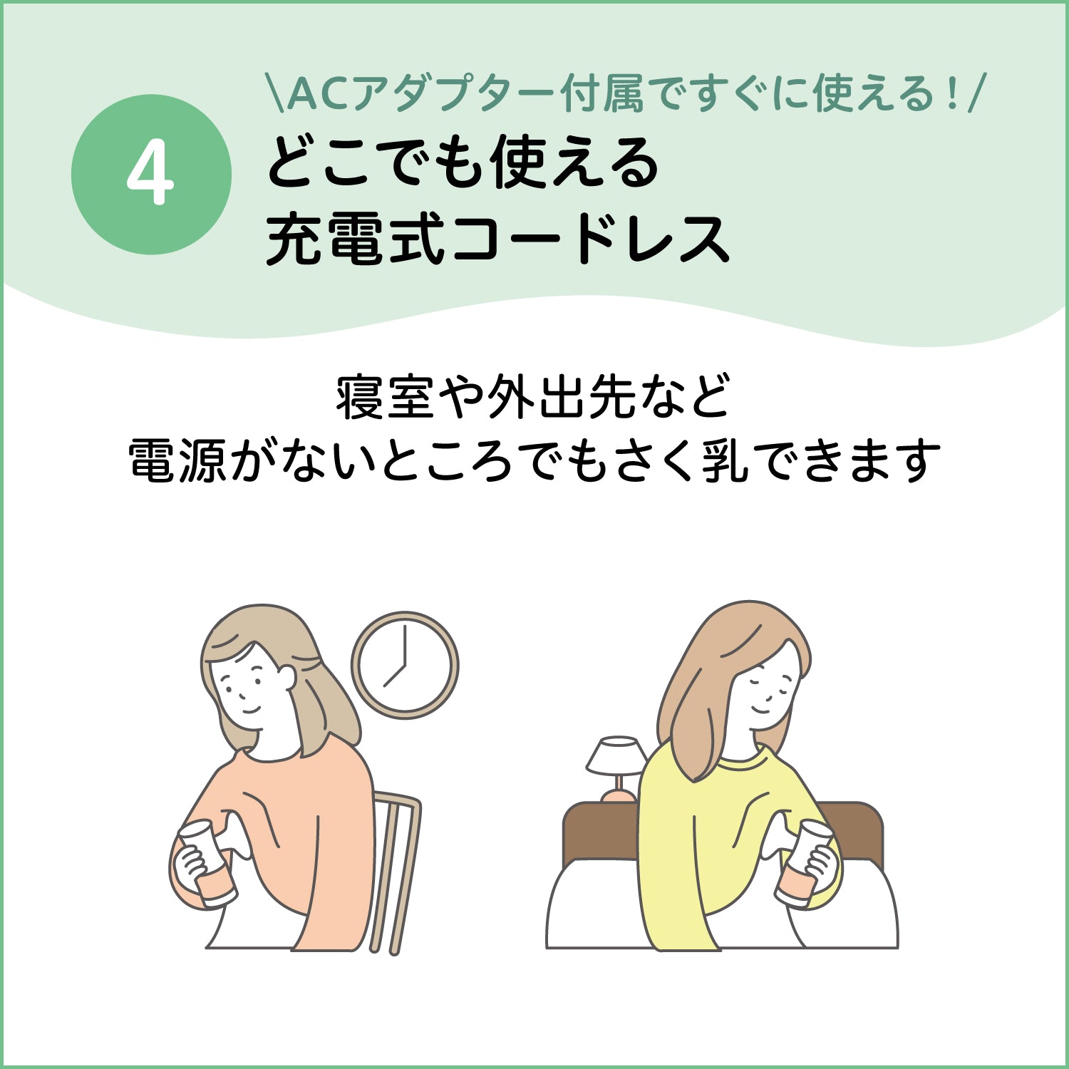 さっと使えるコードレスタイプ、おっぱいにあてるだけでラクラクさく乳することができます。