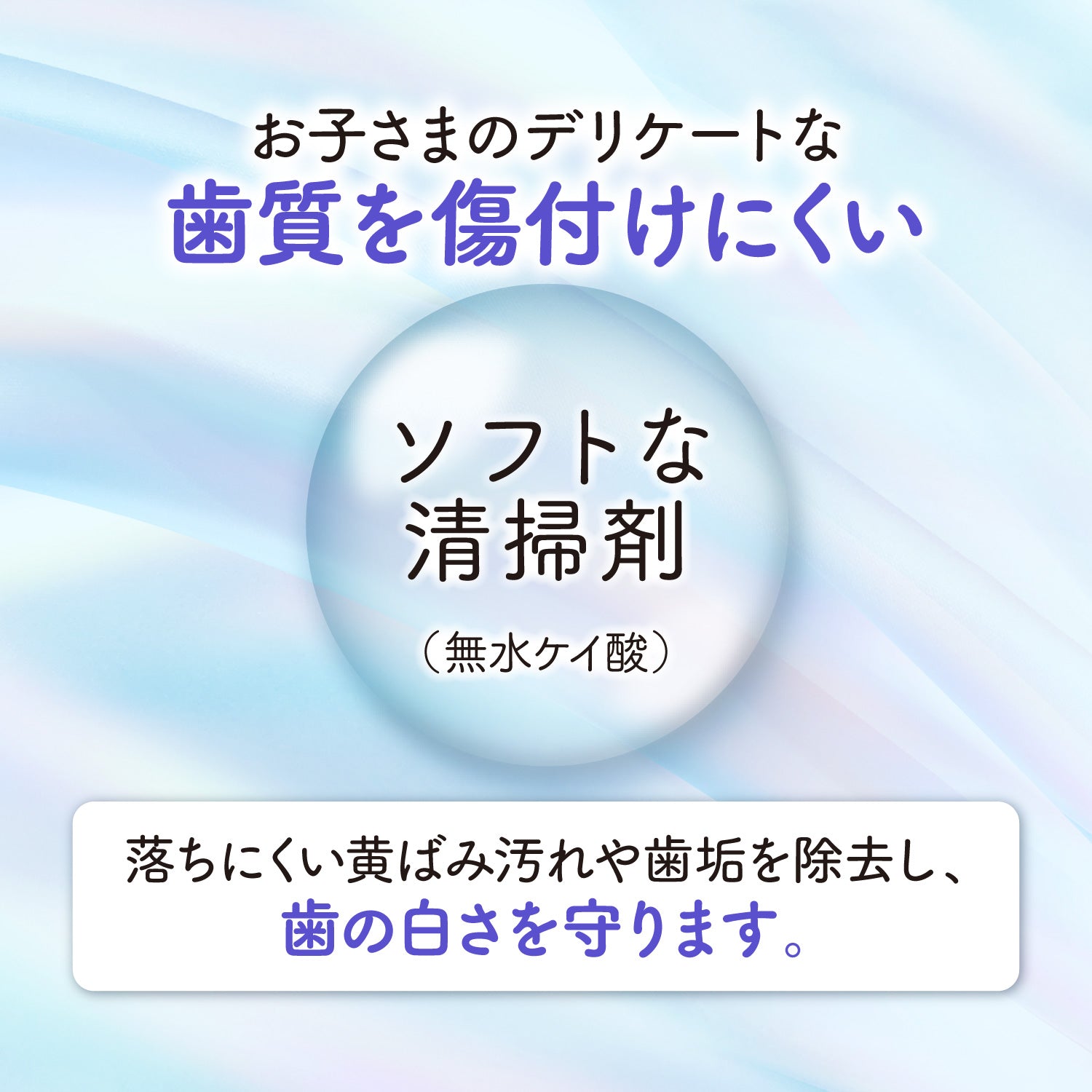 ・お子さまのデリケートな歯質を傷付けにくい、ソフトな清掃剤(無水ケイ酸)を使用。落ちにくい黄ばみ汚れや歯垢を除去し、歯の白さを守ります。