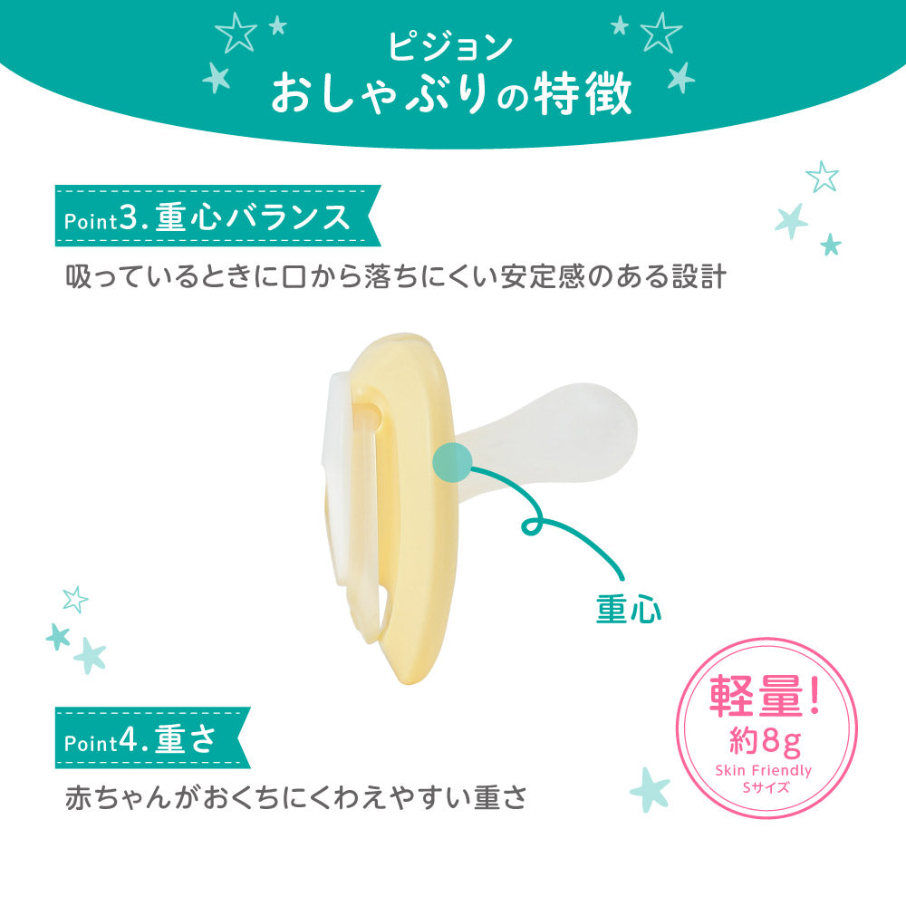 このおしゃぶりは歯列への影響が少なくなるよう、おしゃぶりの軽さ、くわえやすさ、吸い口のやわらかさと形に工夫をしました。