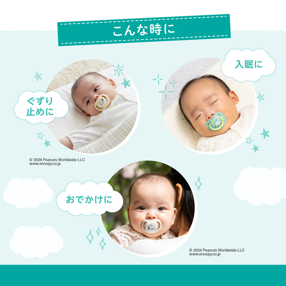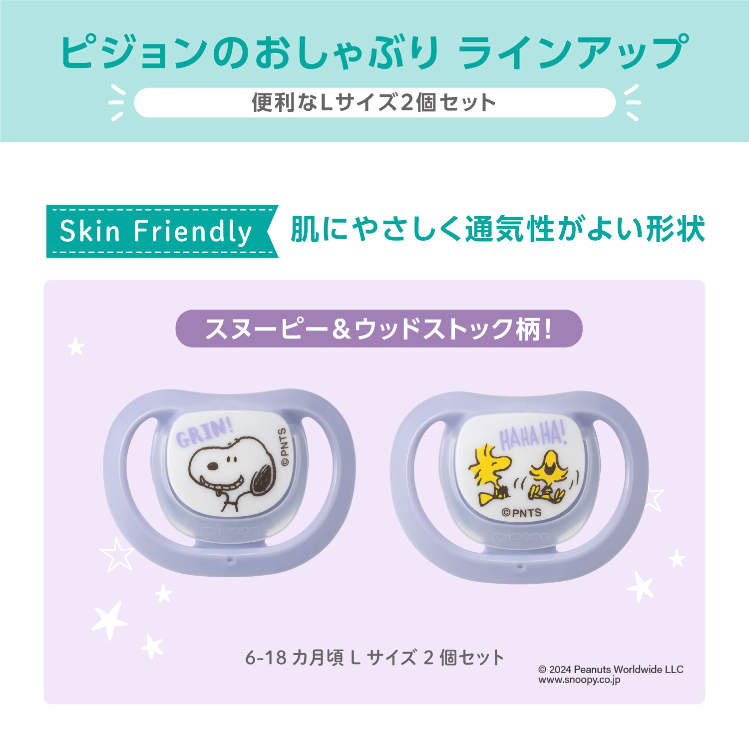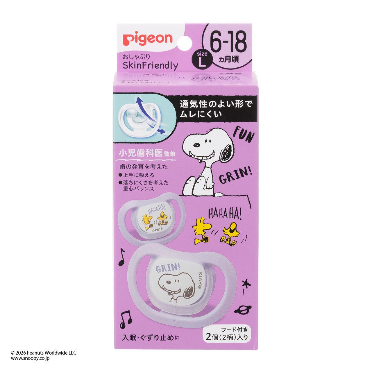 おしゃぶりSkin Friendly 6-18/L 2個入り スヌーピー&ウッドストック柄