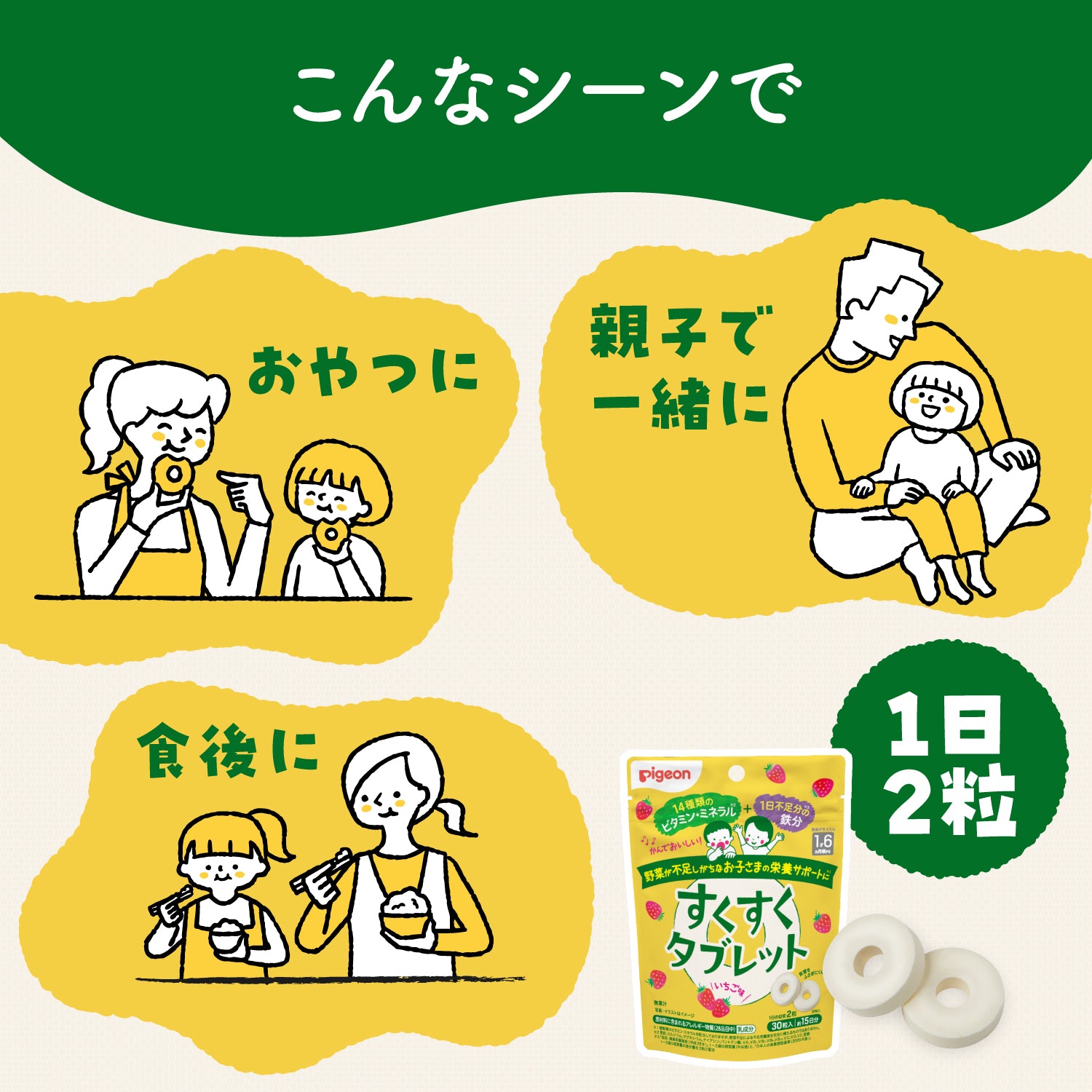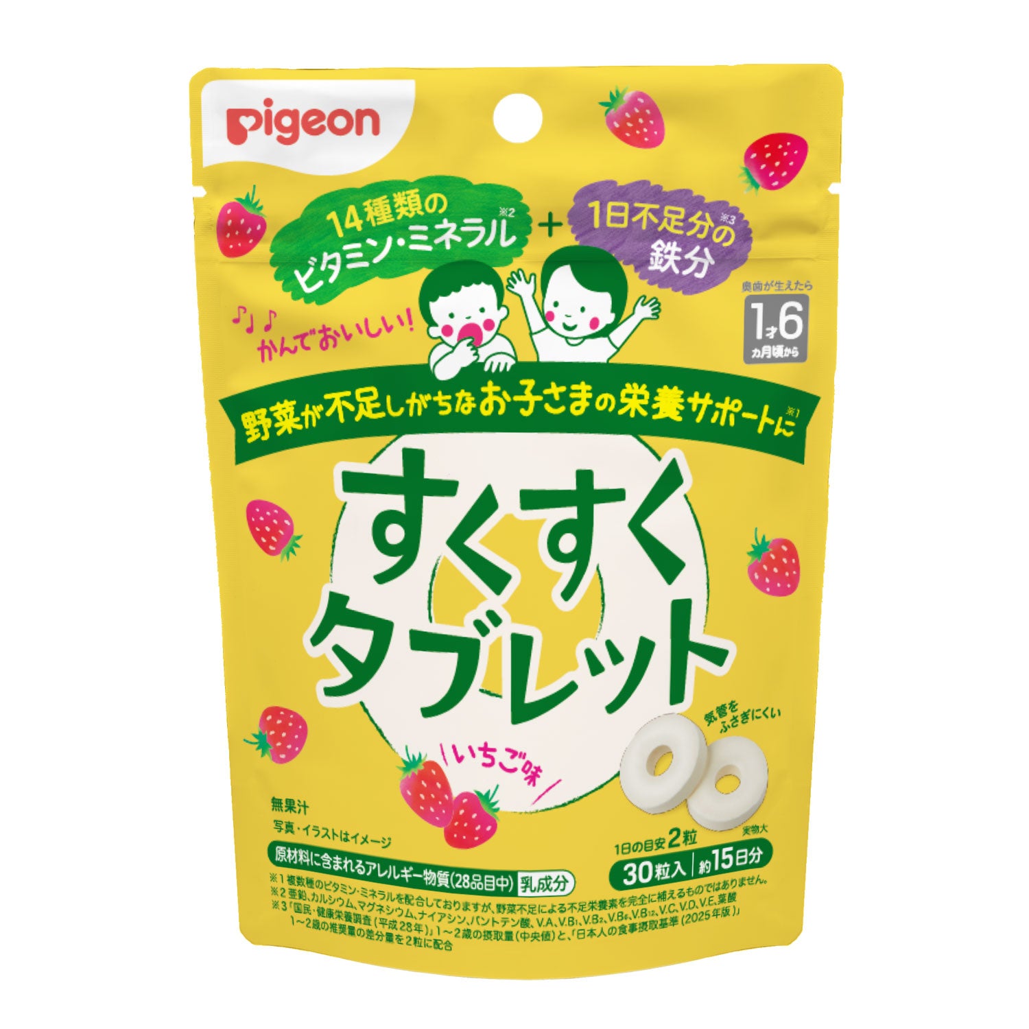 ・お子さまの健やかな成長に欠かせない14種の栄養素と1日不足分の鉄分をおいしく続けやすいタブレットに配合しました。
