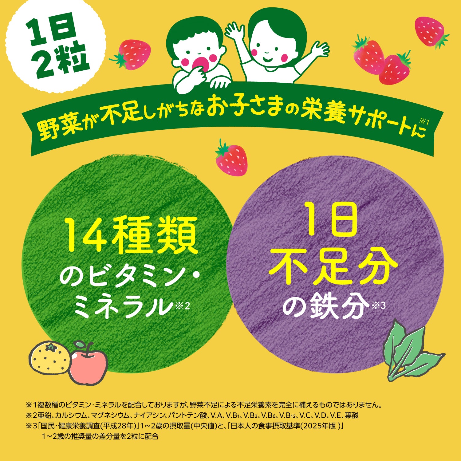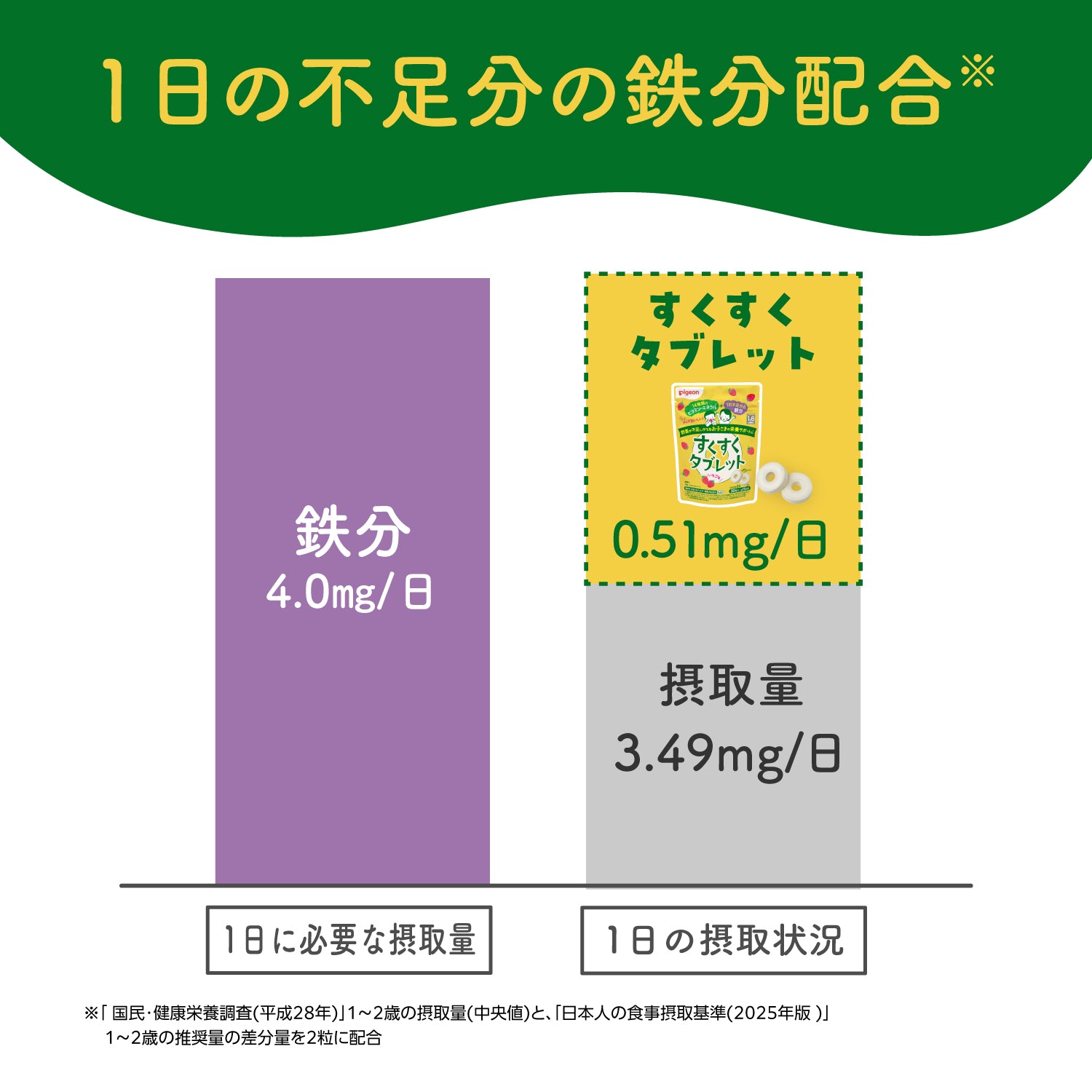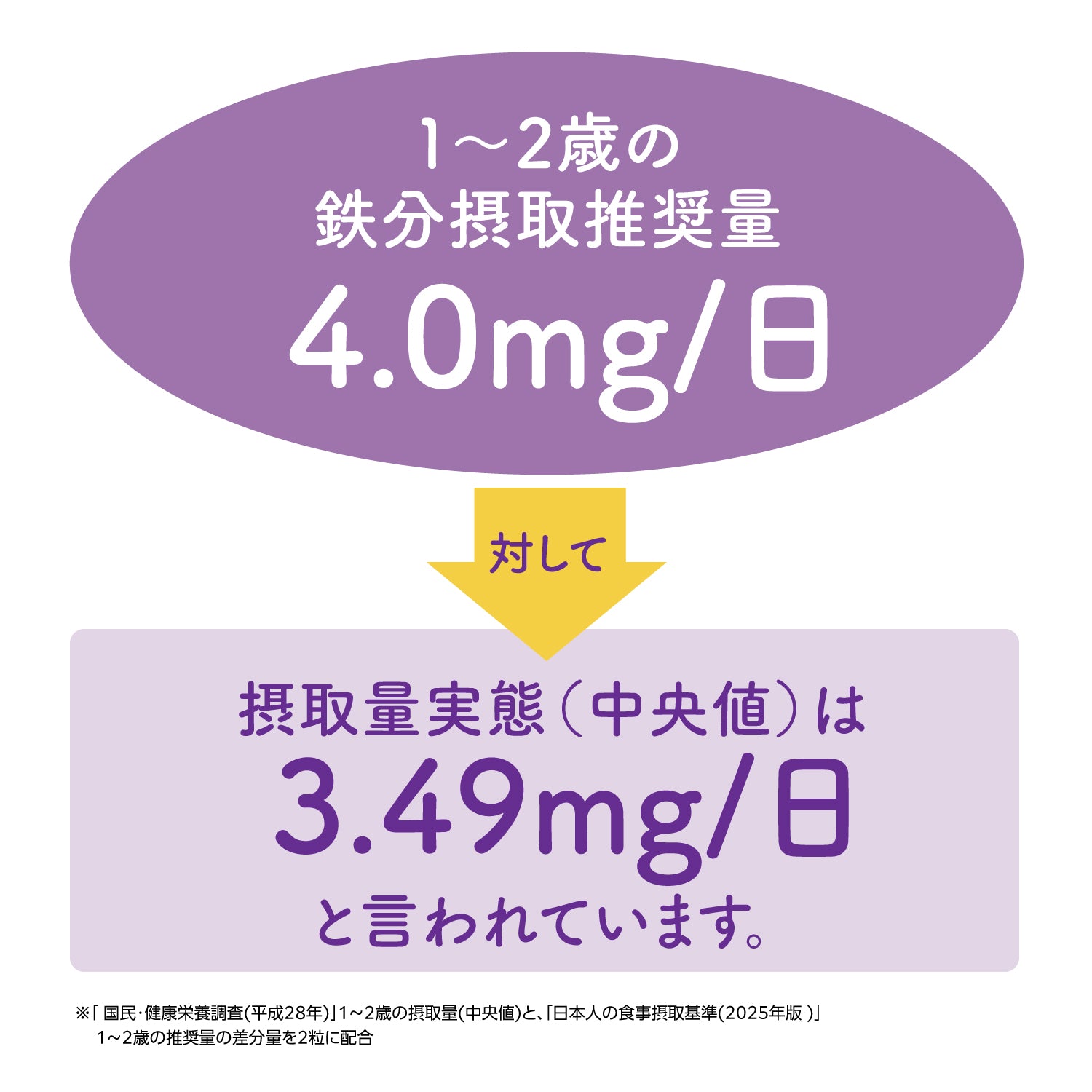 ※3「 国民・健康栄養調査(平成28年)」1~2歳の摂取量(中央値)と「、日本人の食事摂取基準(2025年版 )」